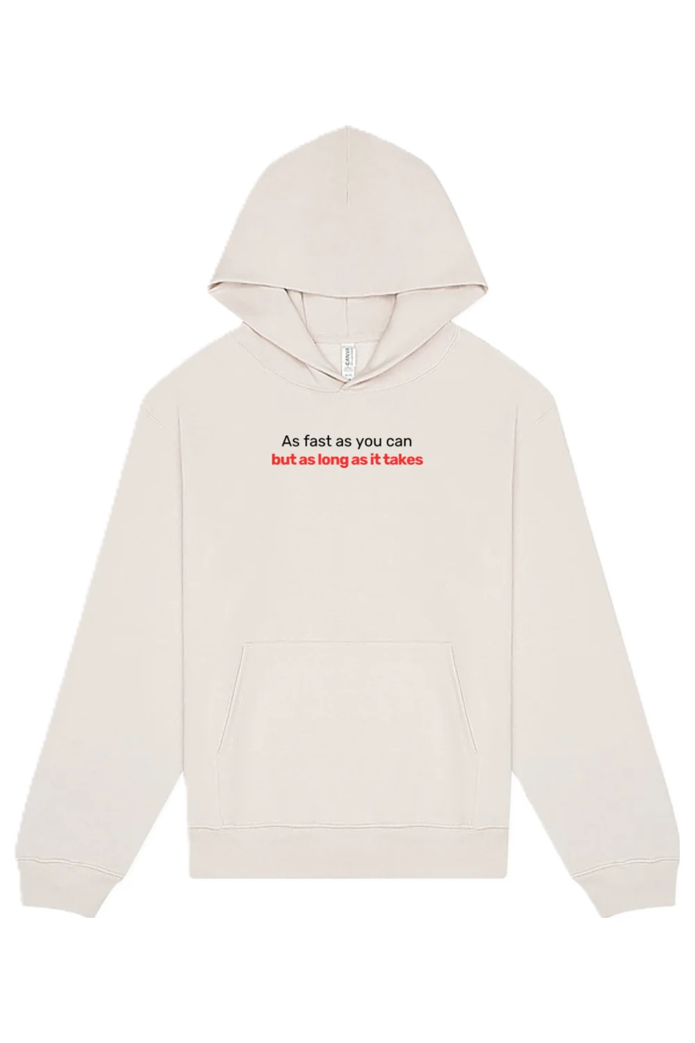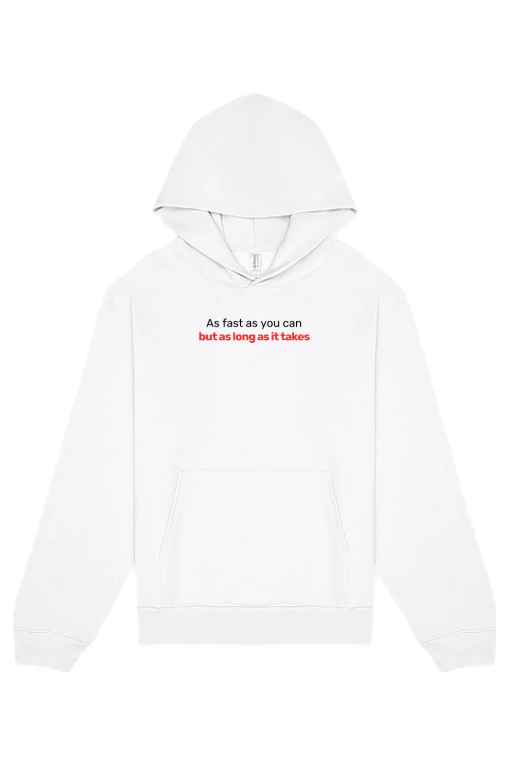 The AS FAST AS YOU CAN, BUT AS LONG AS IT TAKES HOODIE delivers elevated comfort with a relaxed unisex silhouette designed for everyday wear. Crafted with interior brushed fleece, it offers a soft, cozy feel, while single dart construction and slightly dropped set sleeves enhance its modern shape. A double layered hood without drawcord, rib detail cuffs and waistband, pouch pocket, and side seams provide clean structure and functional style. Finished with DTF logos on the front and back, this hoodie makes a bold statement with premium comfort and presence.