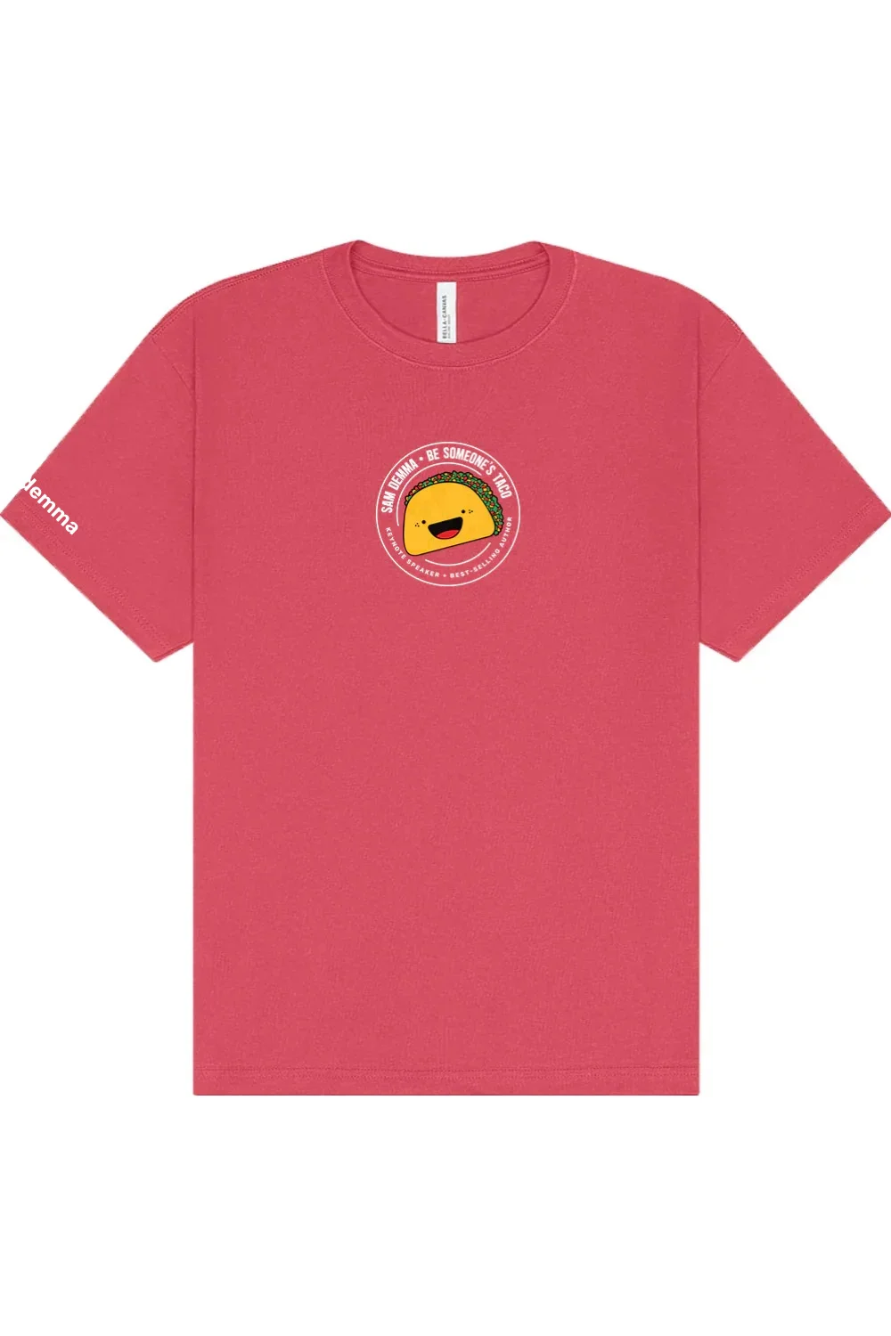 The tee features a 5-inch “Be Someone’s Taco” DTF logo printed on the front, adding a bold and expressive graphic element. It is finished with an @sam_demma logo on the right sleeve.